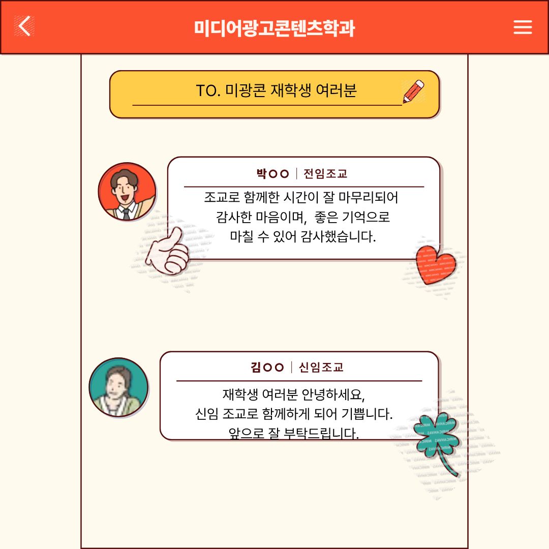 학과를 위해 힘써주신 교수님께 진심으로 감사드리며, 앞으로 함께할 신임 조교님께도 따뜻한 환영의 인사를 전합니다.
