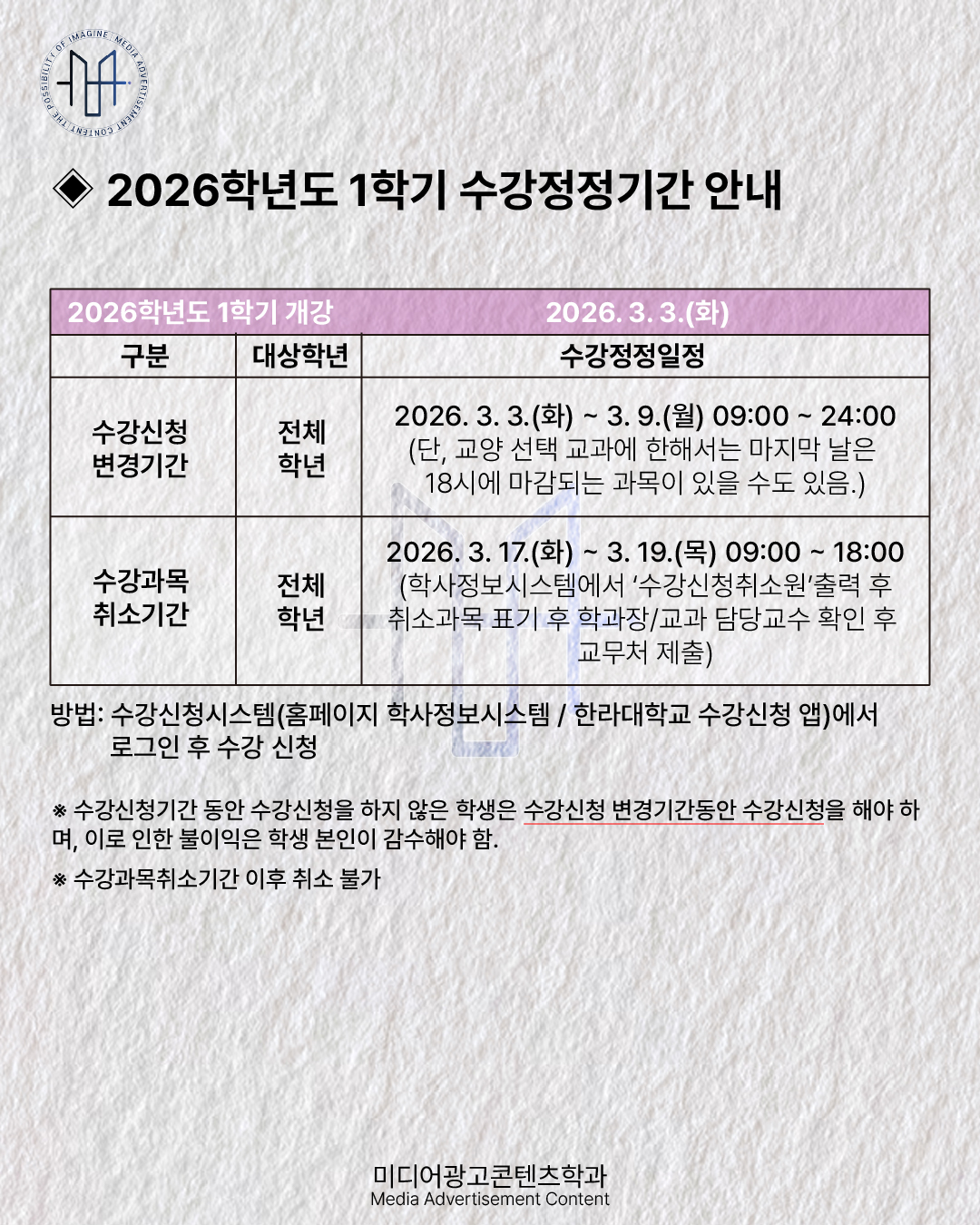 2026학년도 1학기 수강신청 정정기간 안내
