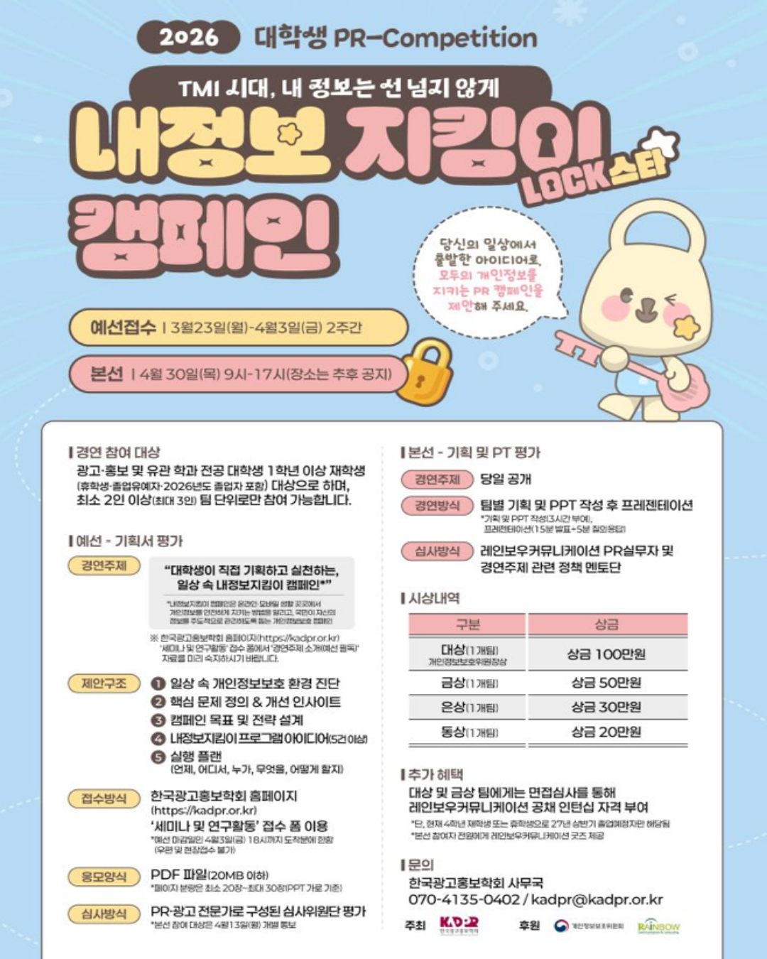 시상내역 대상(1개팀, 개인정보보호위원장상) 상금 100만원 금상(1개팀) 상금 50만원 은상(1개팀) 상금 30만원 동상(1개팀) 상금 20만원
