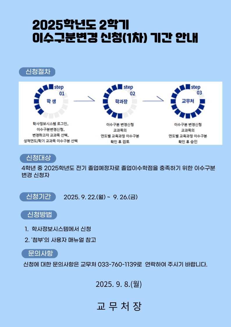 2025학년도 전기 졸업예정자는 아래 기간을 확인하시어 졸업 이수요건 충족을 위한 이수구분 변경 신청(1차)을 진행하시기 바랍니다.