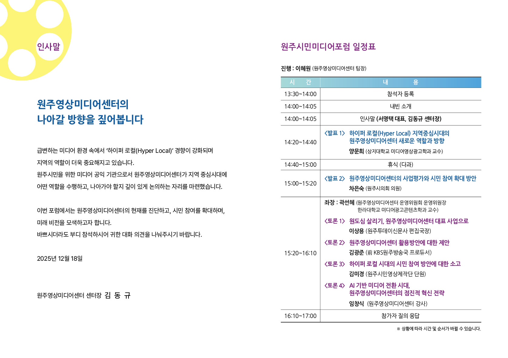 이번 포럼에서는 하이퍼로컬(Hyper Local) 시대의 지역 중심성 강화, 시민 참여 확대를 위한 미디어 활동 지원, 원주영상미디어센터의 역할과 미래 방향 등에 대해 심도 있는 논의가 이루어질 예정입니다.
