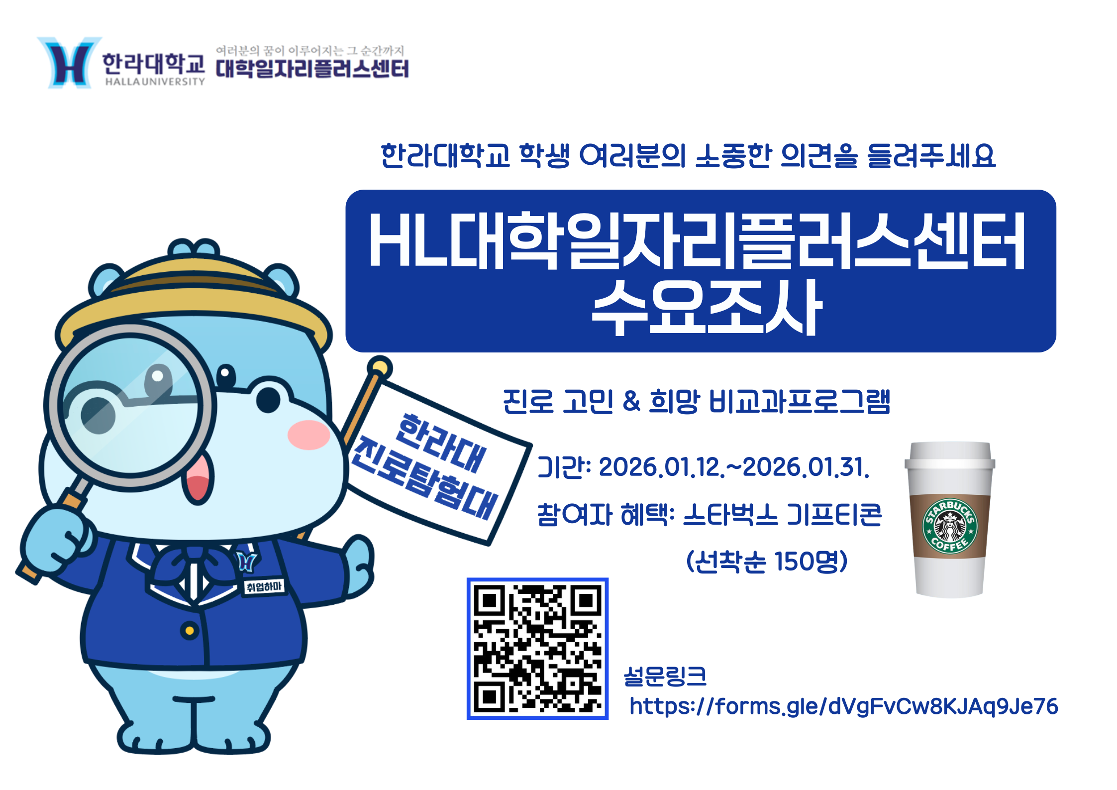 2026.01.12.(월) ~ 2026.01.31.(토)- 조사 대상한라대학교 재학생 전체- 참여 방법온라인 설문 참여 (Google Forms)설문 링크는 QR코드 및 하단 링크 클릭!설문 링크: https://forms.gle/dVgFvCw8KJAq9Je76- 주요 조사 내용* 진로·취업 준비 상태 및 상담 서비스 니즈* 희망 진로 및 취업역량 강화 비교과 프로그램* 희망 취업 유형 및 기타 건의 사항- 참여 혜택선착순 150명에게 스타벅스 커피 기프티콘 증정!여러분의 참여가더 나은 진로·취업 지원으로 이어집니다 많은 관심과 참여 부탁드립니다.문의: HL대학일자리플러스센터