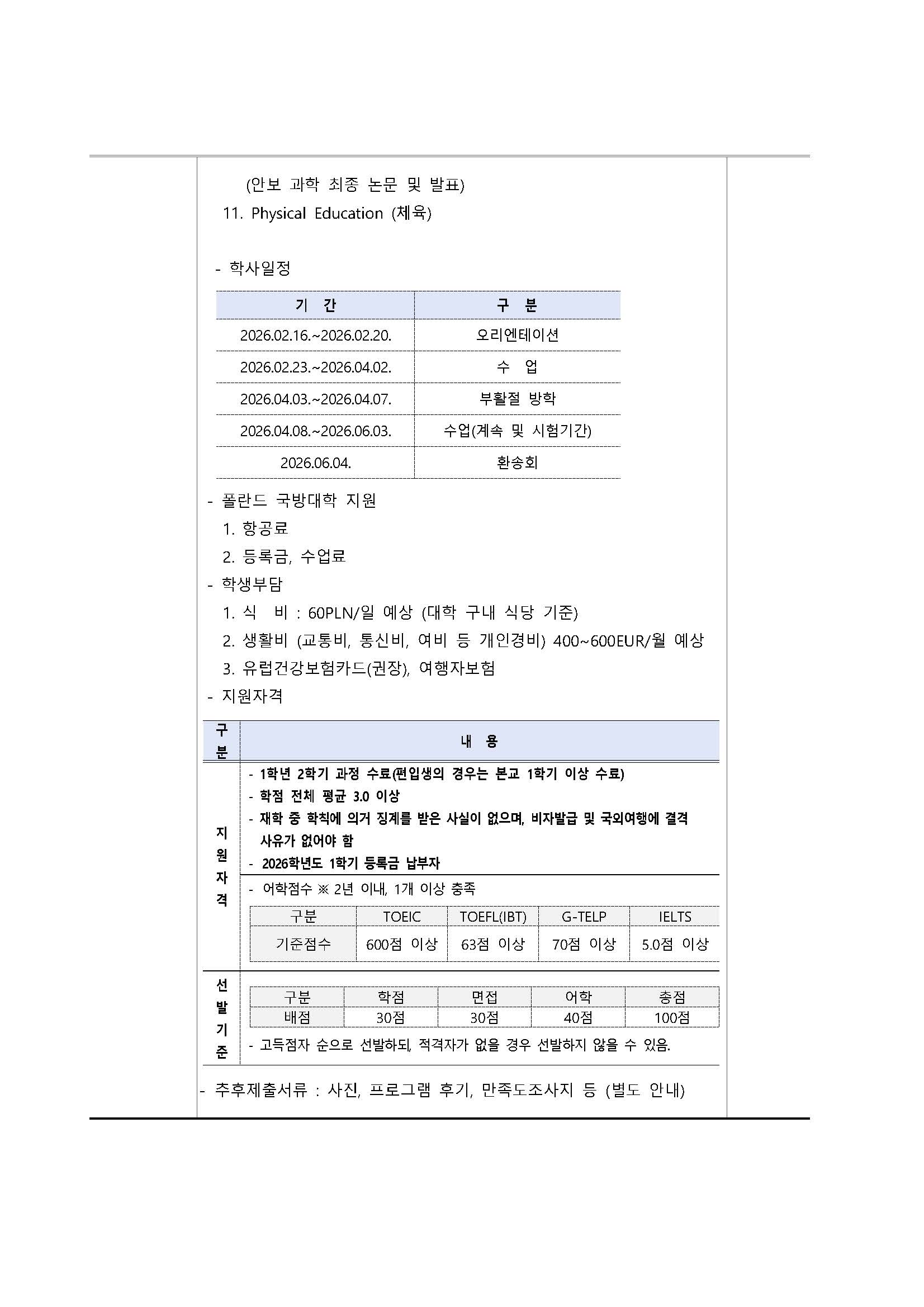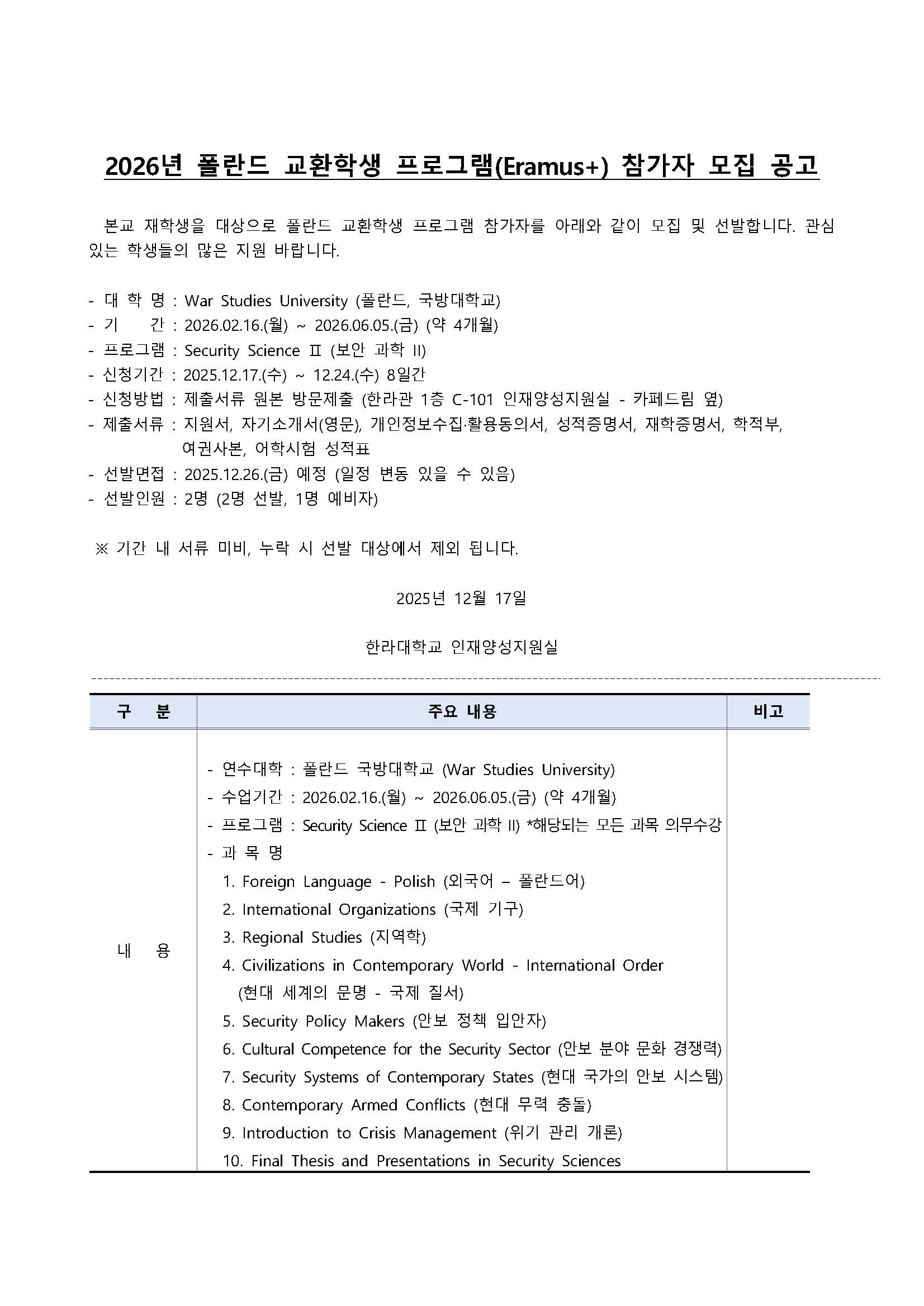 2026학년도 1학기 폴란드 교환학생 프로그램(Erasmus+) 참가자 모집 공고